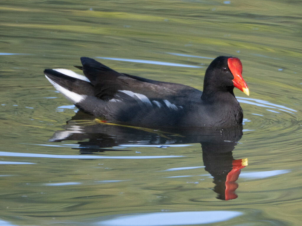 Key features: dark body, red and yellow bill shield, long greenish legs.
