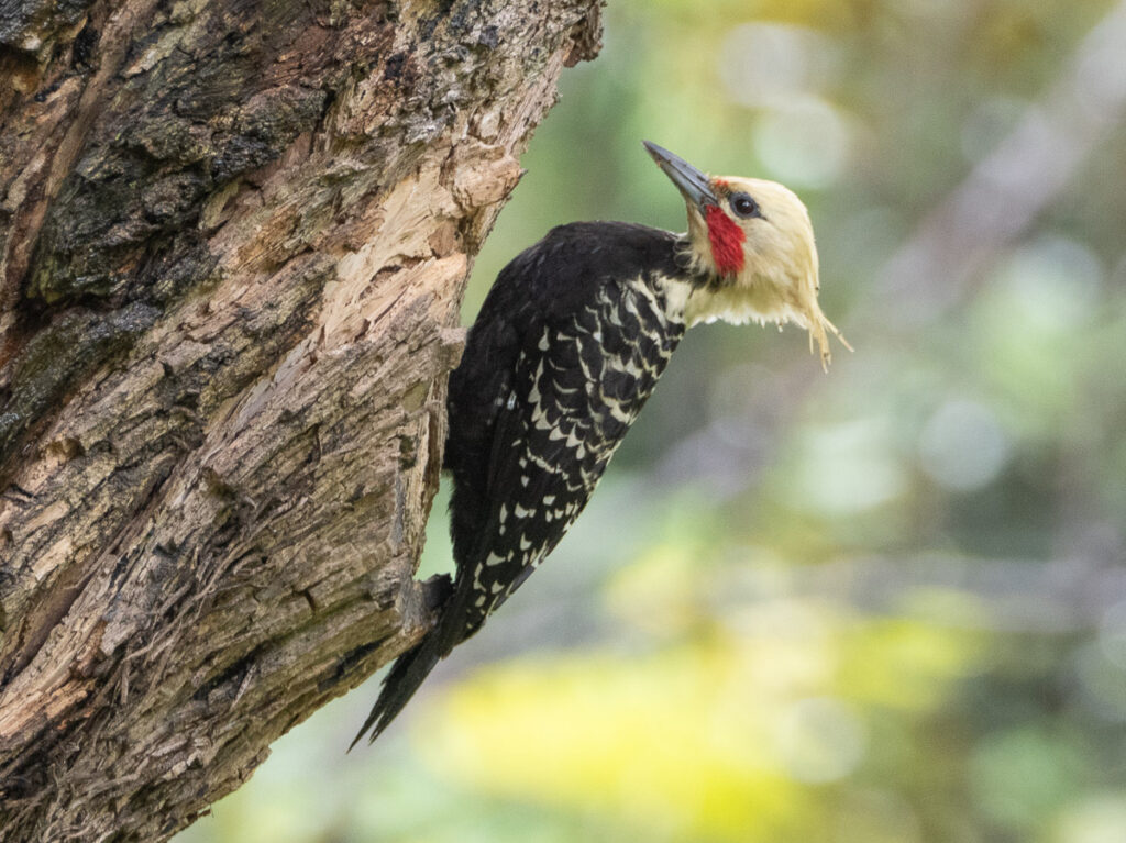 Key features: black-and-white woodpecker, white underparts, yellow facial skin around the eye.