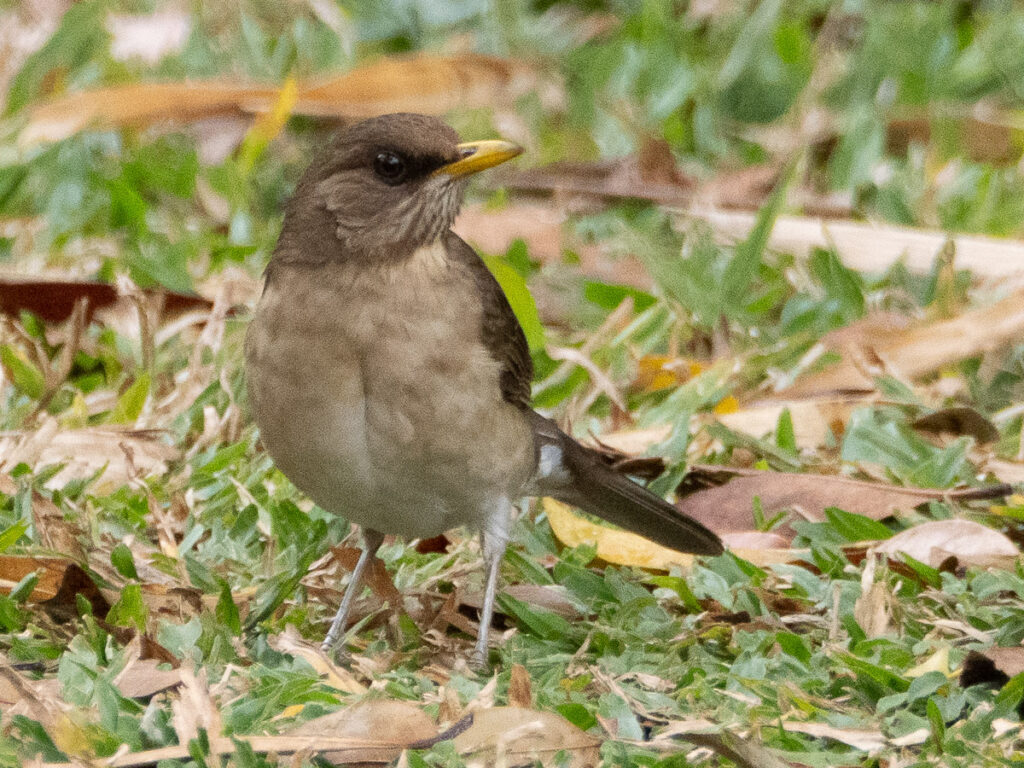 Key features: pale thrush, yellow bill, subtle dark eye markings, less common than Pale-breasted.