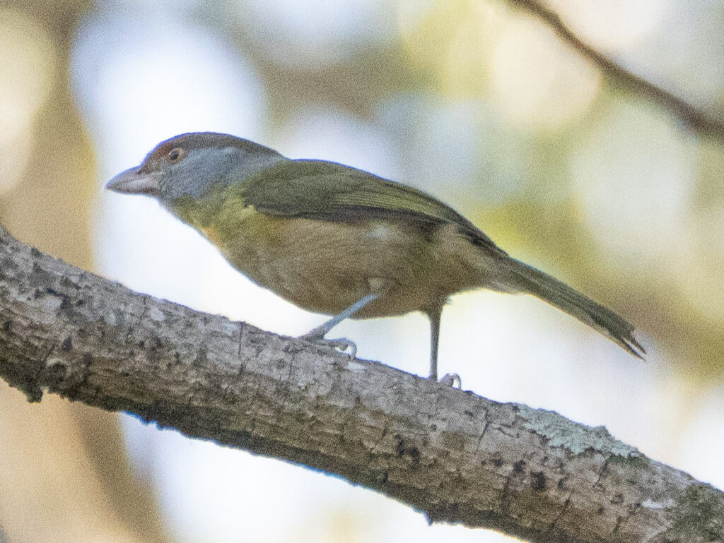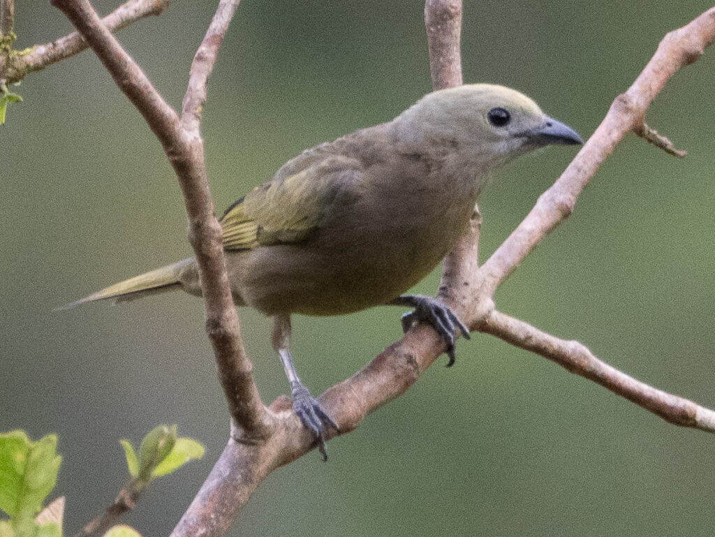 Key features: olive-green tanager, dark eye, similar shape to Sayaca Tanager.