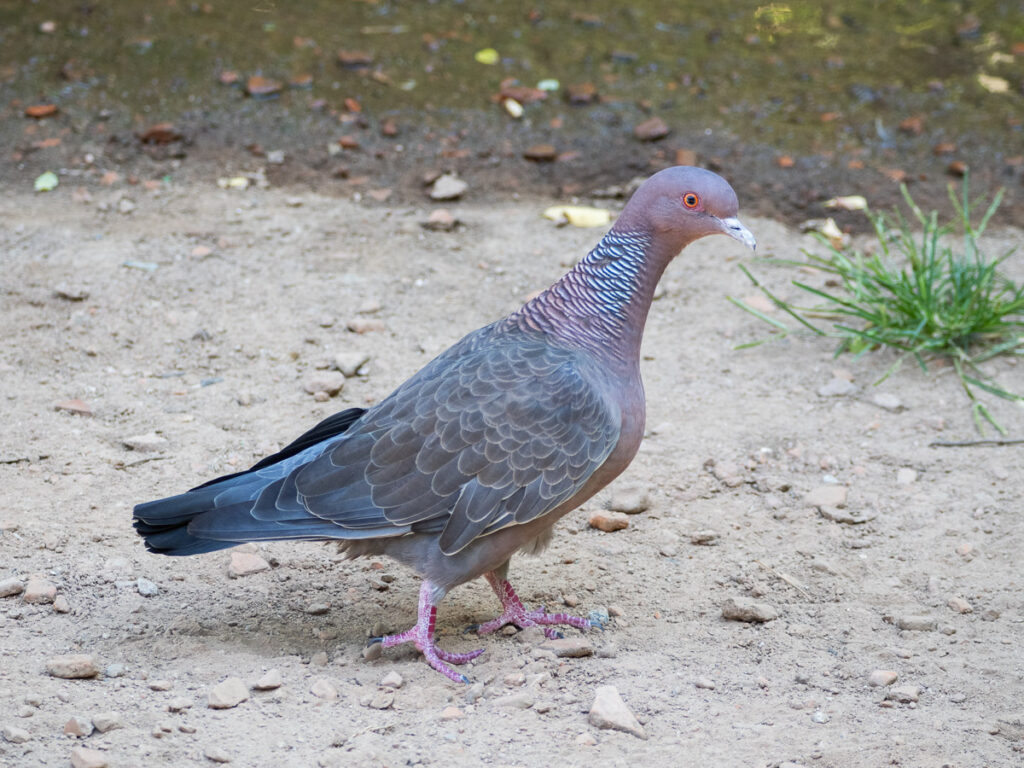 Key features: large pigeon, scaly neck pattern, pale edging to wings in flight.