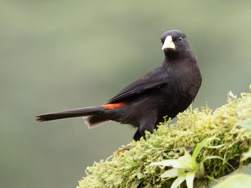 Key features: black icterid, bright red rump mostly seen in flight, hanging nest.