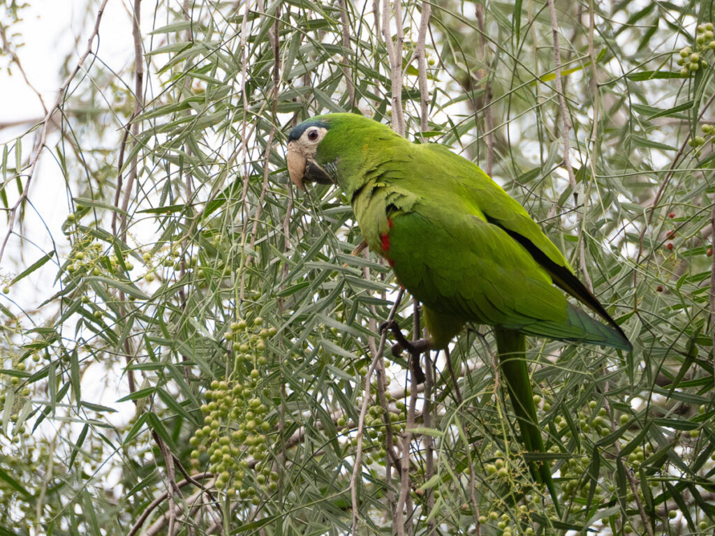 Key features: small macaw, long pointed tail, loud calls, often flies overhead in small groups.