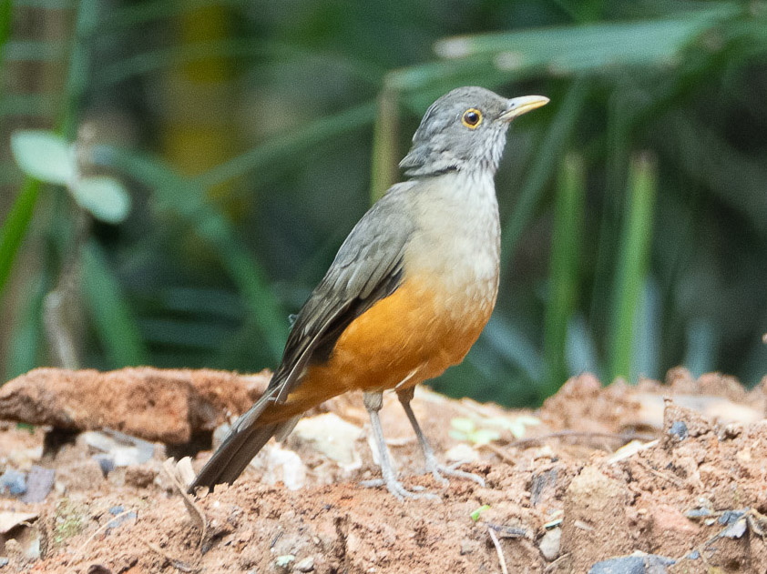 The Creamy-bellied Thrush is the least common of the three common thrushes and the first few times you see it you might easily mistake it for the Pale-breasted Thrush. The key things to look for are the subtle dark markings around the eye and the yellow beak.