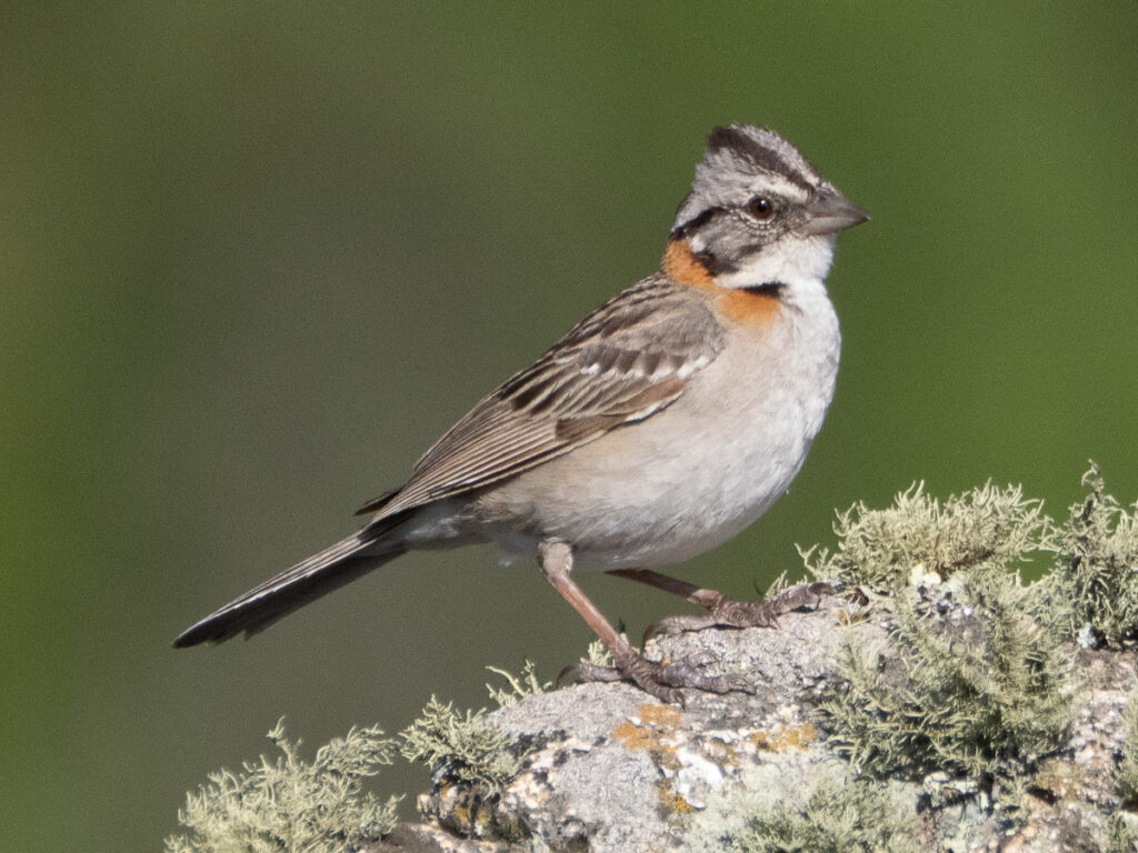 Key features: sparrow-like bird, rufous neck collar, grey-and-black striped head.
