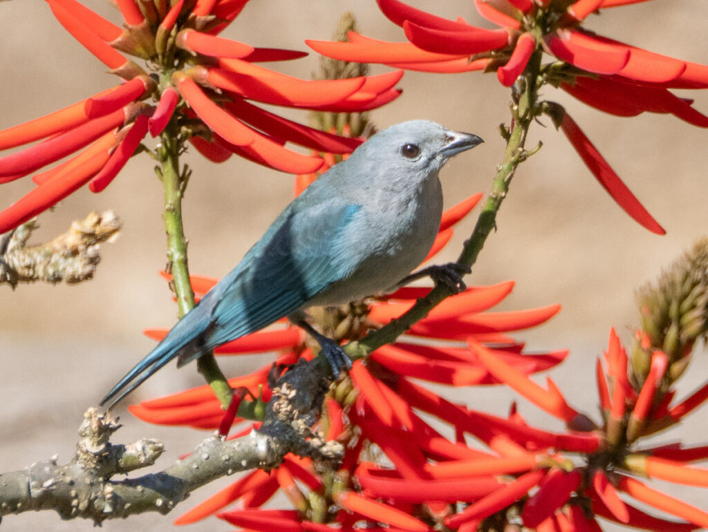 Key features: pale grey-blue tanager, common garden visitor, high-pitched call.