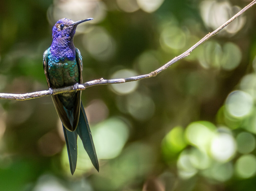 Key features: large hummingbird, long forked tail, metallic green body, aggressive at feeders.