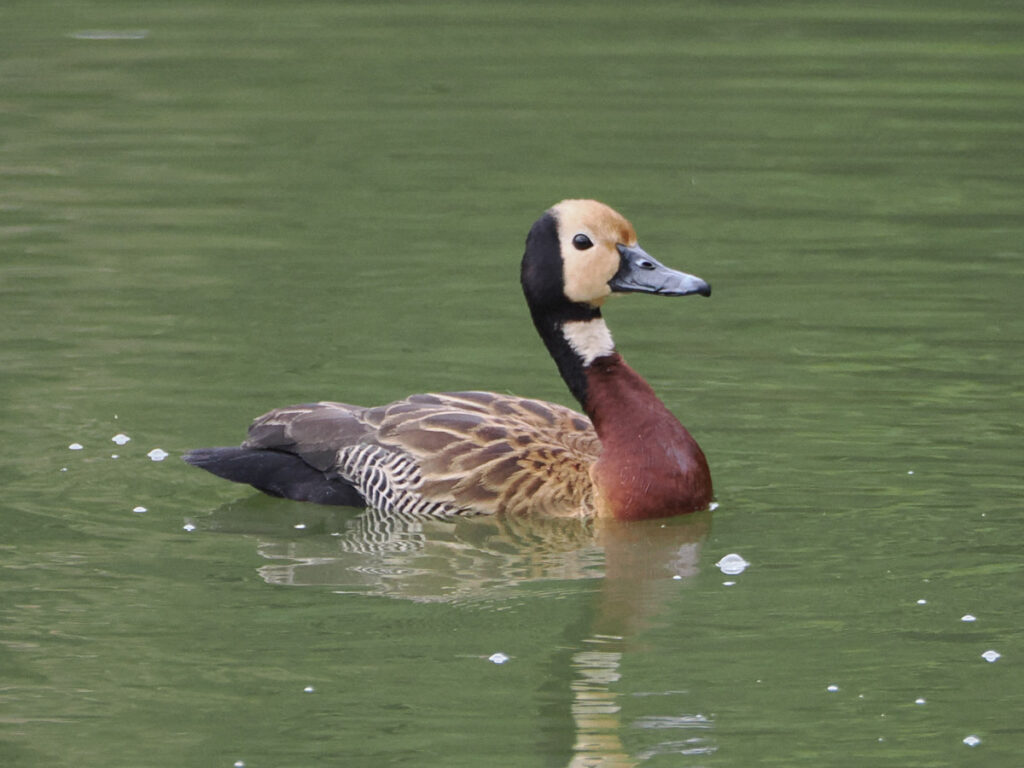 Key features: bold white face, chestnut body, distinctive whistling calls in flocks.